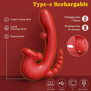 This uniquely designed vibrator combines 9 licking modes, 9 flapping modes, and 9 vibration patterns—all crafted for full-body stimulation. From the realistic dildo shaft to the clit-licking mouth and anal bead tail, this 5-in-1 toy delivers intense pleasure from every angle.