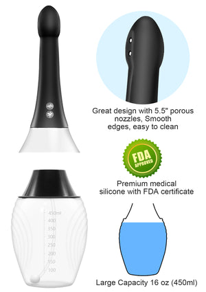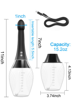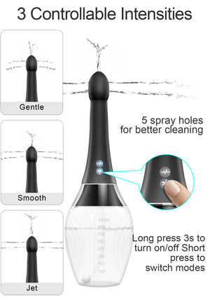 Automatic Electric Enema Kit The enema bulb adopts the electric spray technology, with spray holes and variable speeds. This enema has control methods, allowing you to conveniently control it through the product button or wireless remote control.