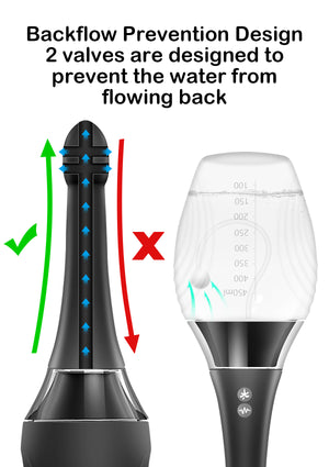 Ergonomic & Anti-backflow Design The innovative shape design enables the arc-shaped nozzle to better fit the body, and the non-slip bottle to better grasp. The enema douche has two one-way valves, which can effectively prevent the backflow of dirty water.